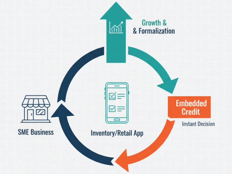 A market woman in Ojuelegba, Lagos, Nigeria, uses a retail app not just to track inventory but to access micro-working capital when stock runs low. The credit decision happens instantly, based on her transaction history within the app. She never visits a bank or fills out a loan application. The financial service is embedded in the commercial tool she already uses daily.